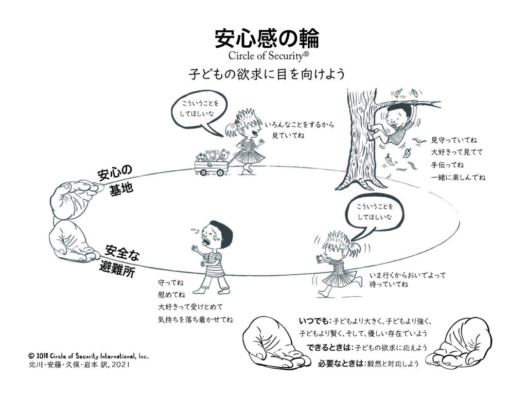 「安心感の輪プログラム」は、この安心感の輪の図に基づいて、子どもの発達にとって重要なアタッチメントの視点を養育者にわかりやすく伝え、関係性をよりよくしていけるようにプログラムされています。